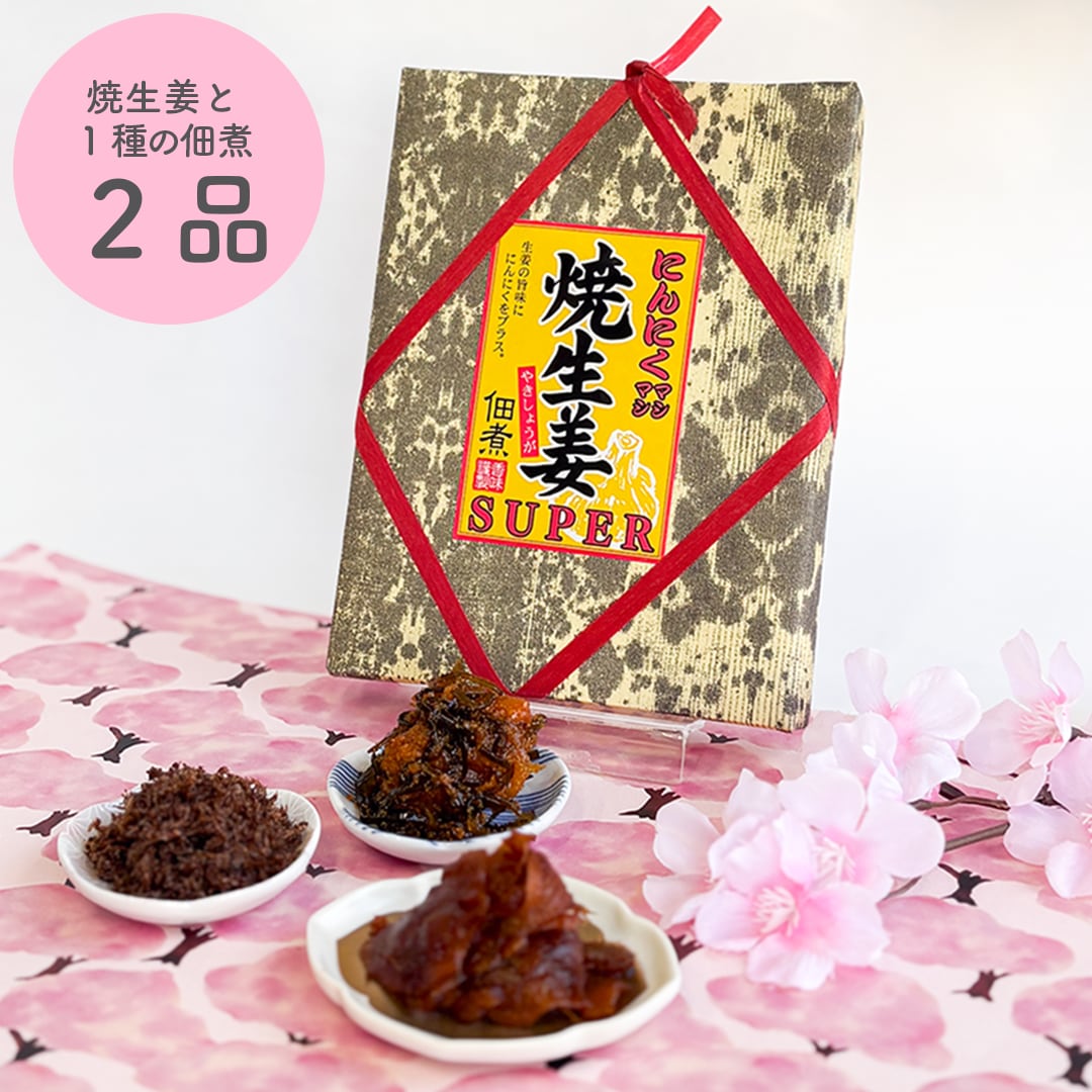 千草屋人気No.1の「焼生姜」と、お好きな佃煮1種類を組み合わせた2品セットです。